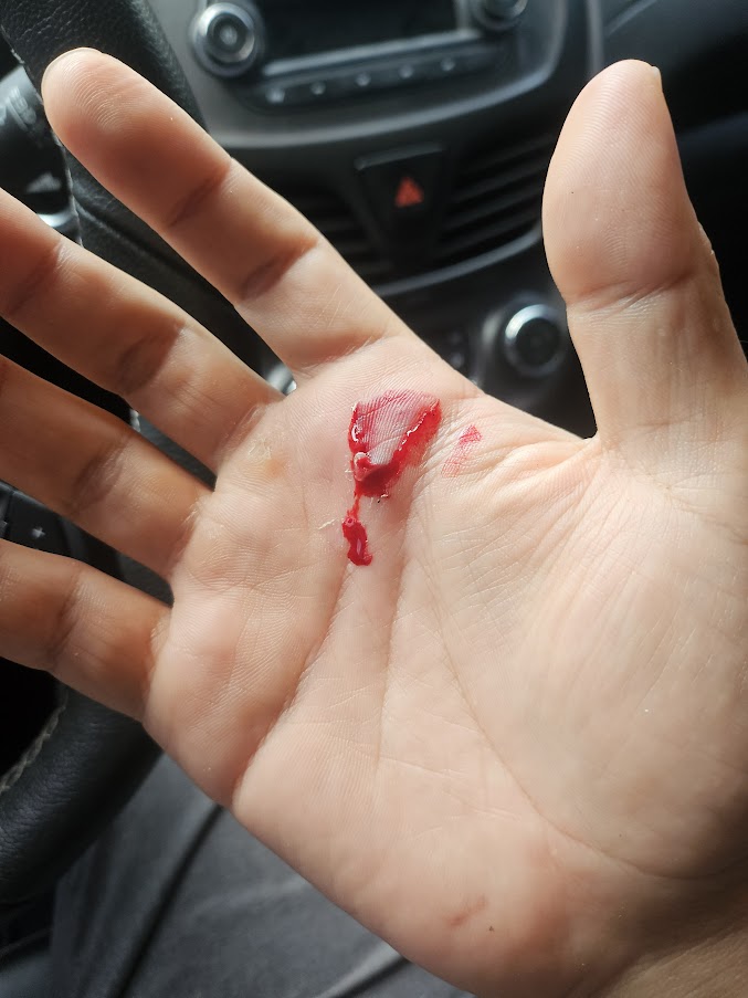 손바닥이 찢어졋다. 살이 들릴정도의 상처가 났다. 대낮 도로가였기 때문에 처음에는 부끄러워서