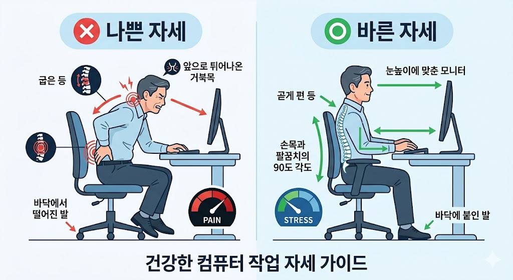 허리디스크는 단순히 나이 때문만이 아니라 생활습관의 영향이 매우 큽니다. 특히 컴퓨터 작업이나 스마트폰 사용 시 허리를 구부리는 자세는 디스크에 큰 부담을 줍니다.