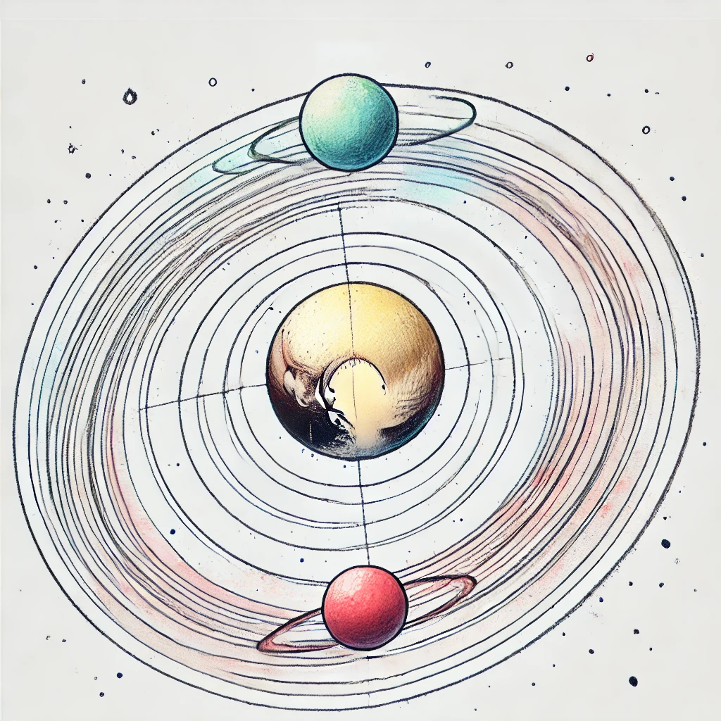 둘 사이의 중간 지점에 ‘공통 질량 중심’(barycenter)이 생깁니다.