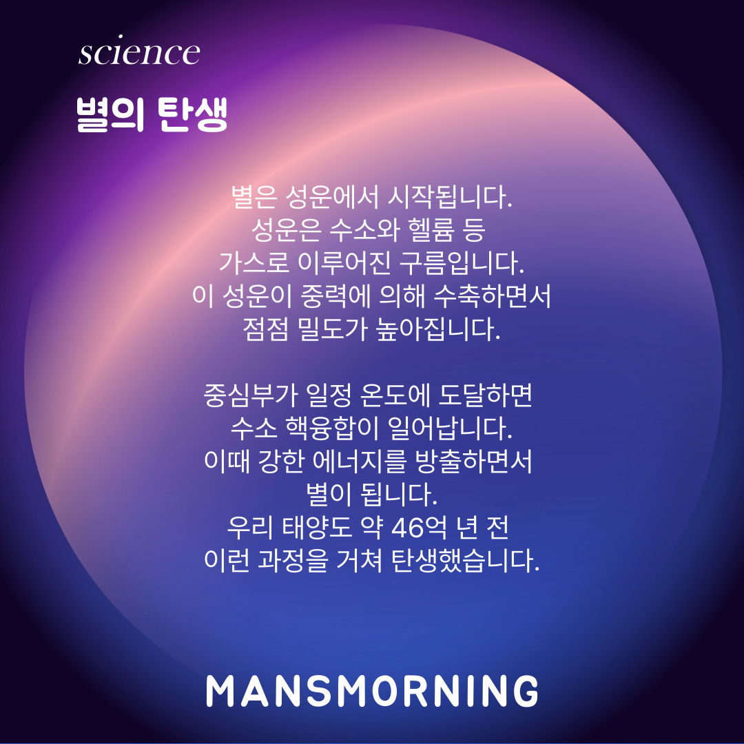 성운 속 입자들이 중력에 의해 점점 모이고 밀도가 높아지면 중심이 뜨거워져 별이 탄생하게 됩니다.